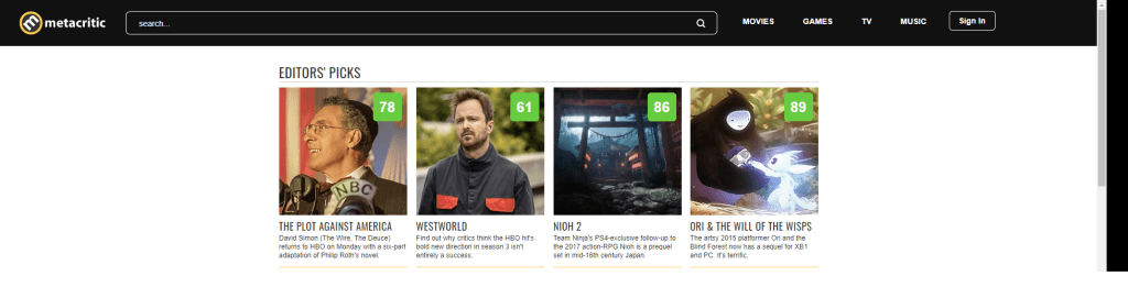 Metacritic’s Editors’ Picks featuring the shows The Plot Against America and Westworld, and video games Nioh 2 and Ori & the Will of the Wisps.